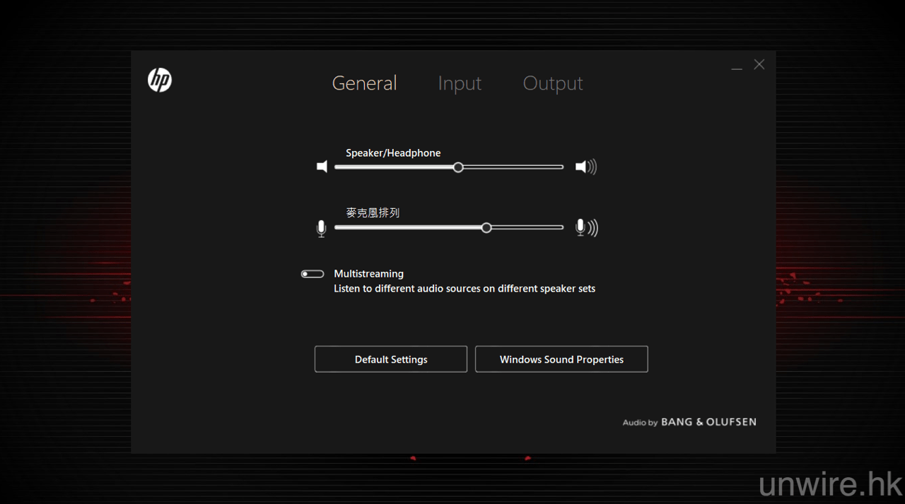 ▲內建了管理音效的軟件,當中一個名為 Multistreaming 的功能,可以用不同喇叭播放不同軟件的音效,例如:如果用家接駁了外置喇叭,可以用外置喇叭播放打機時的音效的同時,亦可設定以 Omen 15 內置的 B&O 喇叭播放音樂。