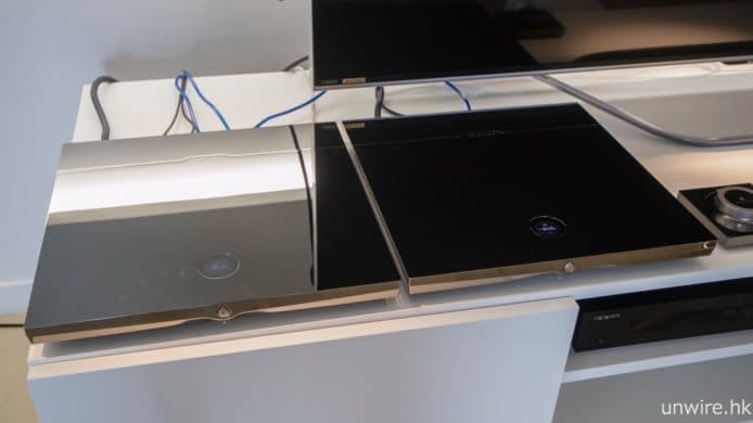 說回 Devialet Private Lounge,該 VIP 試聽室佔地超過一千呎,裝潢與該品牌當下兩大產品線 Phantom 及 Expert Pro 系列一樣走極簡路線,視聽室內更擺放著超長弧形梳化,讓到訪的貴賓可以舒適地欣賞 180 度落地玻璃下的維港景致。至於可供試聽的器材方面,Devialet Private Lounge 可分為家庭影院及兩聲道發燒音響兩個部分,前者核心為由 7 部 Gold Phantom 組成,並用上裝設 VanityHD 音訊模組的 Oppo BDP-103 作為訊源,透過同軸連接至 Devialet 自家 DSP 控制器將 LFE 聲道訊號抽出,然後透過光纖重新分發至 7 組 Gold Phantom,建構成 7.7 聲道環繞聲系統。