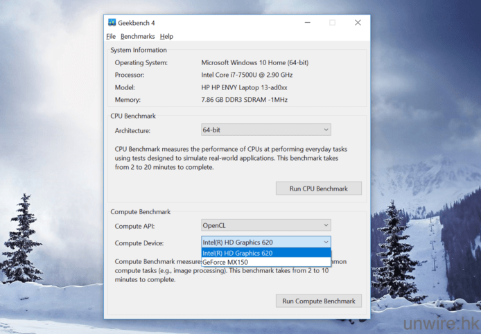 ▲再用 Geekbench 4 中的整體系統性能測試,測試在 Intel HD Graphics 或 NVIDIA GeForce MX150 顯示晶片下的 HP Envy 13 (2017) 在效能上分別是否很大,從得分可見,前者獲得 20,087 分,後者獲得 39,104 分,雖然有近 2 萬分的分別,但這分別在實際應用上,其實不算明顯。