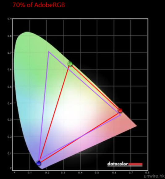 ▲色域方面,從結果得知 HP Envy 13 (2017) 的熒幕擁有 70% AdobeRGB 色域,以輕薄機來說算是合格,不過要留意是綠色顯示方面不算理想,幸好紅色及藍色算不錯。