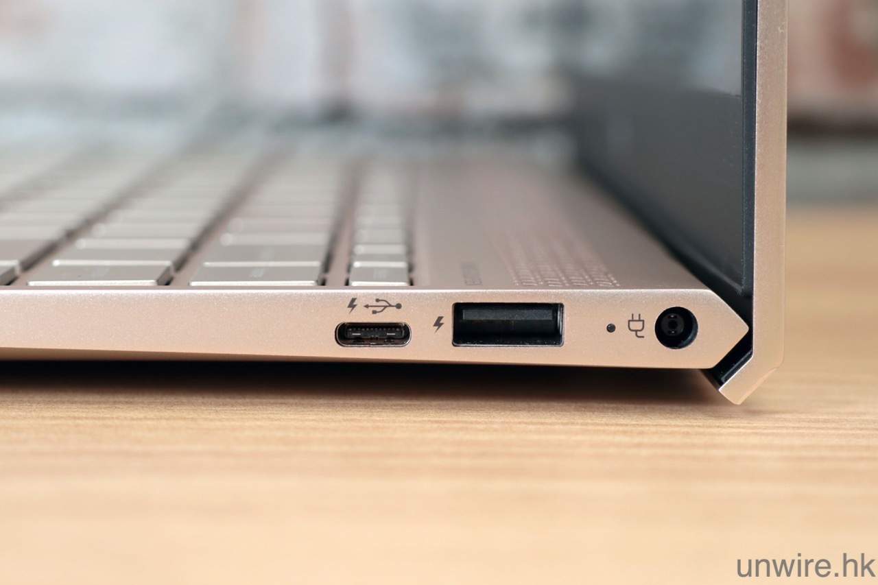 HP Envy 13 (2017) 與上代一樣,仍然是採用全金屬機身製造,硬淨度十足,就連鉸位都是採用金屬製造,機身耐用度十分高。金色機色設計之餘,厚度及重量分別為 15.4mm 及 1.3kg,雖然以 13.3 吋機款來說,不是十分輕薄的設計,但外攜度都仍可勉強接受,只是單手拿機一會兒仍然會有點累而已。此外,它的端子都算齊全,除了有 2 個傳統大細的 USB 插槽外,亦有 2 個 USB-C 插槽,方便接駁不同的 USB-C 週邊產品或充電火牛,不過要留意的是,它始終是 Core i 系機款,所以即使有 USB-C 插槽,但仍不能接駁一般為智能電話充電的「尿袋」差電,令大家長時間外出使用時,仍需要帶備火牛以備不時之需。