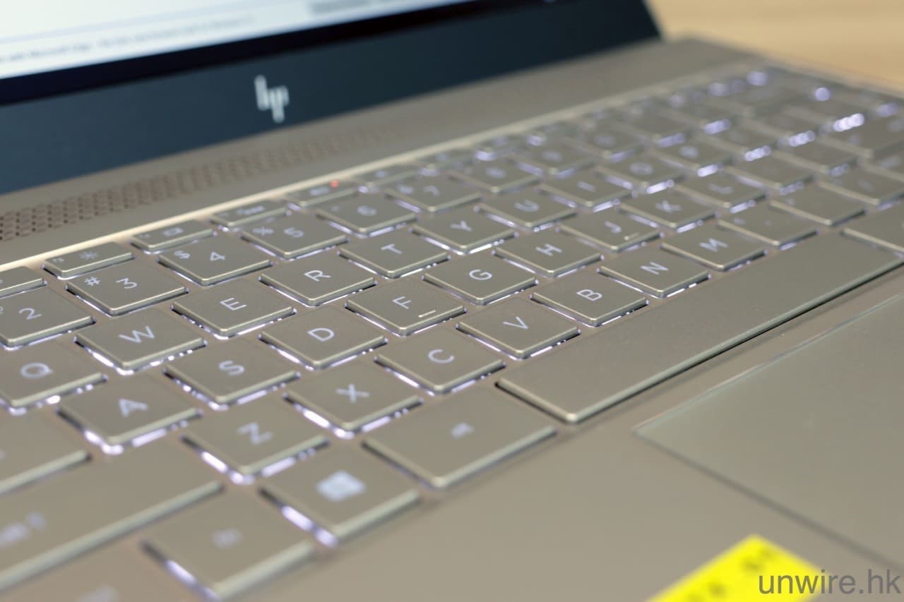 至於鍵盤方面,Envy 13 (2017) 採用一般輕薄型機款都有採用的 full-sized 鍵盤設計,佈局大致上算「大路」,唯一是 Home、Pg Up、Pg Dn 等按鍵設於最右方位置,而不是 Backspace、Enter、Shift 等,使用時確要一點時間適應。至於 TouchPad 方面,它的面積亦夠大,可以輕鬆以多手指操控。不過筆者用過幾日,發覺不算好用,原因是它的按鍵或 TouchPad,回彈力不算足夠,甚至需要用點力按下去才有反應,如果要長時間打字或使用 TouchPad 操控電腦,不算舒服,可說是它的一大缺點。幸好它的鍵盤仍設有白色背光,在較暗地方仍可看到不同按鍵的位置,這一點算是做得足吧?