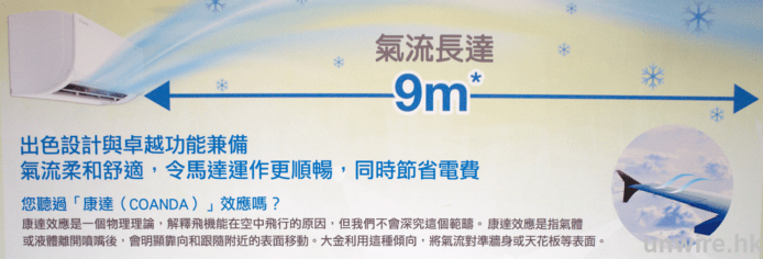 Daikin 除了推出世界上第一部採用 R32 雪種的家用冷氣機,還利用了「康達效應」(Coanda Effect)的設計。「康達效應」是指氣流或水流會隨著靠近物件的表面而流動的現象,Daikin 利用「康達效應」設計出風面板,令氣流向上升,吹出氣流可長達 9 米遠,帶走天花板的熱力,讓冷風平均散佈室內,使冷氣不聚於近處,更有效利用整個空間更省電。