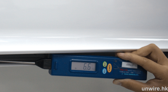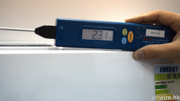 正常分體式製冷機都會放在室外,不過今次測試場地所限,製冷機一同放在室內,測試時未有明顯的噪音,相信實際安裝在一般家居環境會更為安靜。製冷方面,由入風口量度,溫度約 23 度,直接於出風口量度為 6 度左右,通常兩者相差 10 度以上,就代表冷氣機的製冷能力足夠,實測相差 13 度,達標有餘。而開機後 3 分鐘開始感覺到室內溫度變涼,製冷迅速。