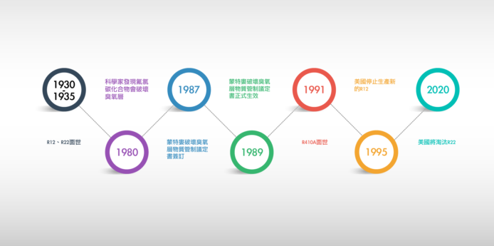 在 1980 年代之前,二氟二氯甲烷(R12,常用於汽車冷氣/小型冰箱)及一氯二氟甲烷(R22,常用於住宅冷氣機/商用冷氣/冰箱)為普遍使用的雪種。但在發現臭氧層破洞問題部分成因,源於這類氟氯碳化合物(Chlorofluorocarbon,CFC)會破壞臭氧層,於是聯合國 26 個會員國在 1987 年於加拿大蒙特利爾簽署「蒙特婁破壞臭氧層物質管制議定書」(Montreal Protocol on Substances that Deplete the Ozone Layer)」,限制氟氯碳化物的生產,同時促進研發對環境影響較小的新雪種。