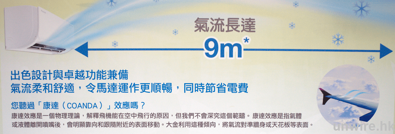 Daikin 除了推出世界上第一部採用 R32 雪種的家用冷氣機,還利用了「康達效應」(Coanda Effect)的設計。「康達效應」是指氣流或水流會隨著靠近物件的表面而流動的現象,Daikin 利用「康達效應」設計出風面板,令氣流向上升,吹出氣流可長達 9 米遠,帶走天花板的熱力,讓冷風平均散佈室內,使冷氣不聚於近處,更有效利用整個空間更省電。