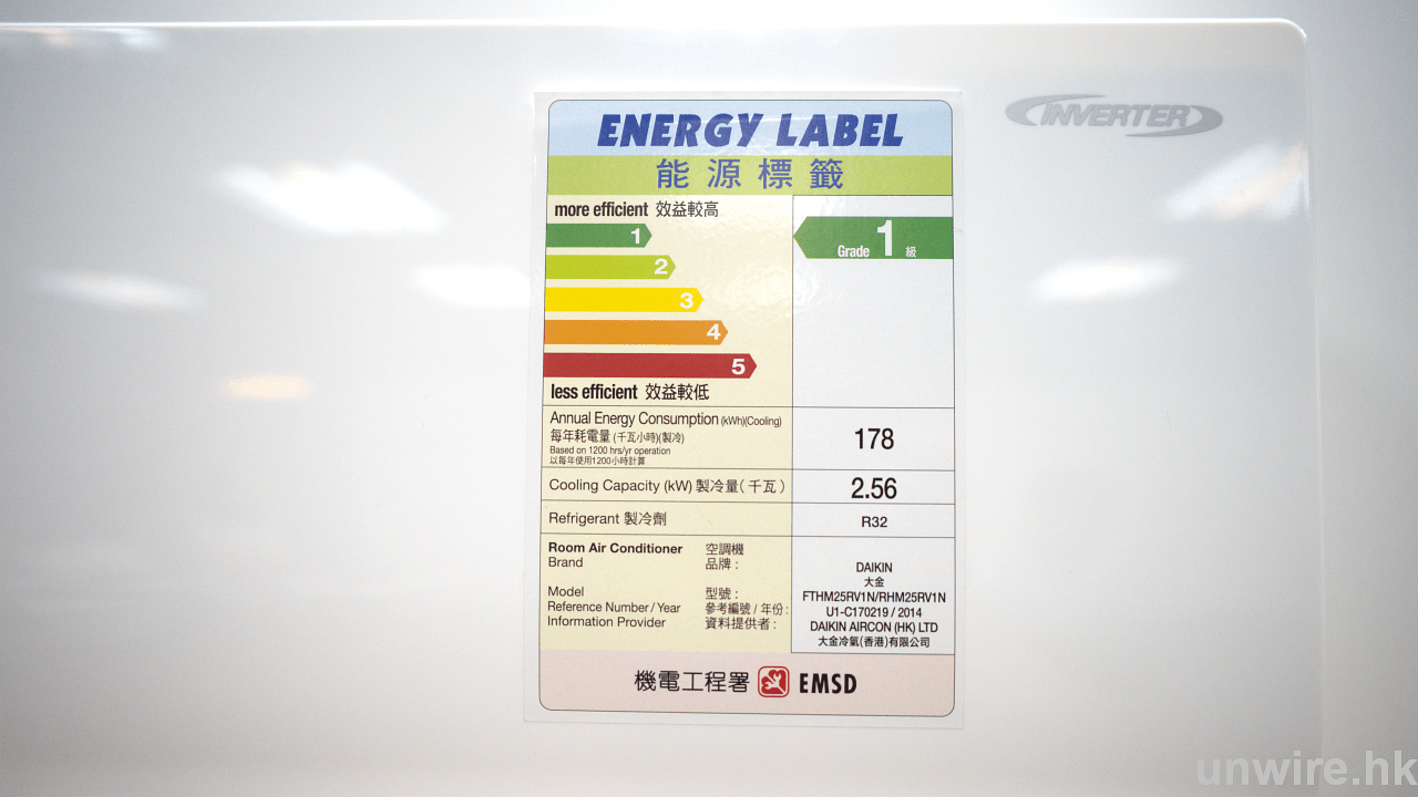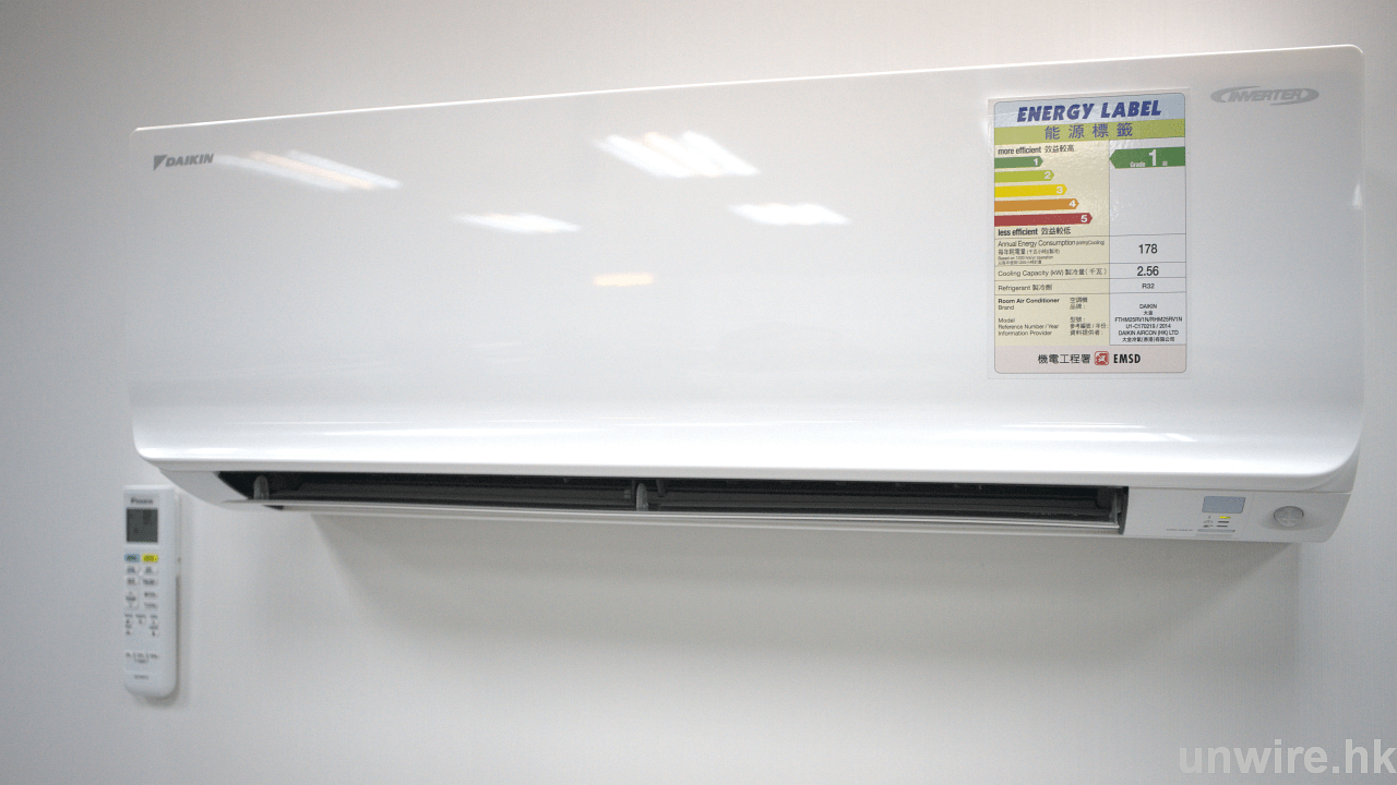 Daikin R32 變頻冷暖系列除了採用導熱性較佳的 R32 雪種,比市場上使用主流環保雪種的冷氣機更可節省 10% 電能,而且還取得一級能源標籤,以今次測試的 1 匹型號為例,每年耗電量 178kWh、製冷量 2.56kW,CSPF 數值為 5.74,代表在獲得一級能源標籤的型號中,能源效益相當高。