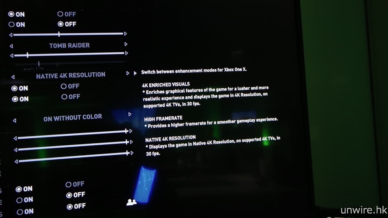 ▲ 據 Kevin Gammill 回應艾域的查詢,不同遊戲的「Xbox One X Enhanced」功能將會有所不同,例如《Forza Motorsport 7》就會提供 4K HDR 60fps 原生畫面,而像圖中的則是《Rise of the Tomb Raider》,則會提供全高清高幀率、4K 30fps 原生畫面及 4K 視覺效果強化 3 種選項。