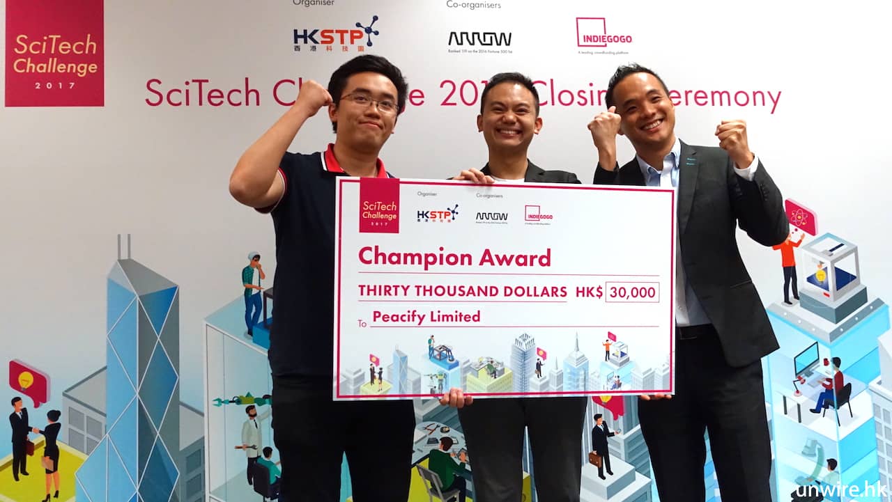 坊間的創業比賽一般會以參加者的產品的商業計劃、預計利潤等作為優勝標準,香港科技園公司今次搞搞新意思,舉辦「SciTech Challege 創業比賽」,參賽者不但需要將腦中意念化成一件產品,產品更要適合放上眾籌平台作宣傳及集資。比賽於昨日誕生優勝者,最終由研發監測嬰幼兒生理指標的智能襪仔「Peacify」奪得冠軍,得到港幣 3 萬元獎金及「環球電梯募投比賽 2017」的參賽機會,產品亦將會放上眾籌平台集資。