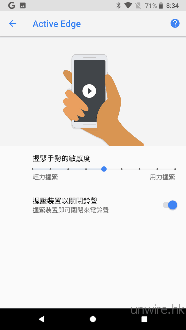 ▲另一個 Pixel 2 比較特別的操控,就是加入了類似 HTC U11 Edge Sense 的 Active Edge 功能,只要輕輕「揸一揸」機身下半部的兩邊機身,就可啟動 Google Assistant 或在有來電時關閉鈴聲。
