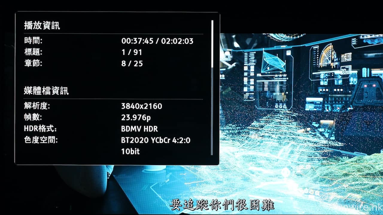 在兩部電視上比較 CXUHD 與 Oppo UDP-203 在播放同一張 4K UHD BD 時的畫面,艾域覺得 CXUHD 即使連接著非 HDR 的 4KTV(Panasonic TH-40CX600H),畫面亦有更為乾淨,而細節銳利度則不相伯仲。