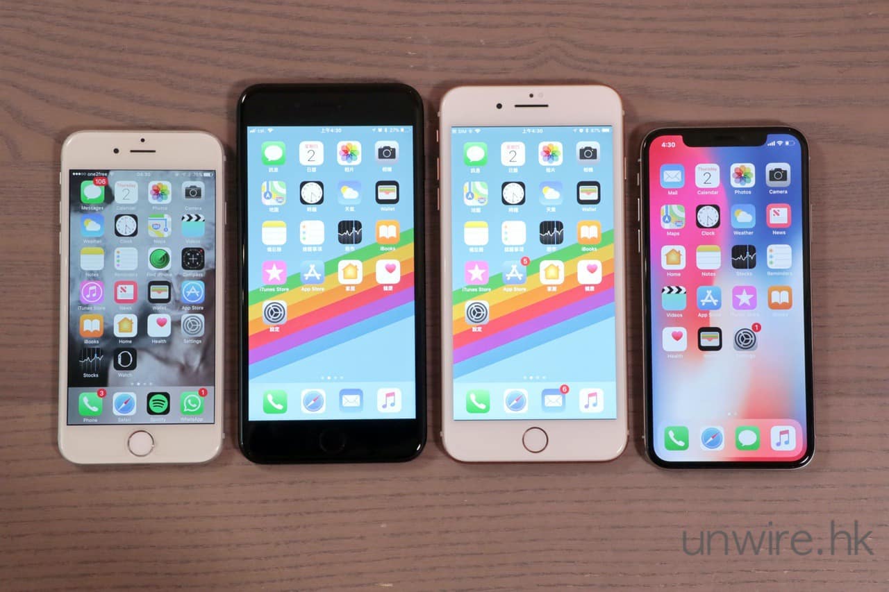 ▲上面兩張圖,由左至右分別是 iPhone 6s、iPhone 7 Plus、iPhone 8 Plus 及 iPhone X,從機身可見 iPhone X 只是比 iPhone 6s 大少許,但確實比 iPhone 7 Plus / 8 Plus 細一大截,不過熒幕就比任何一部機都要大!另外材質方面,iPhone X 基本上與 iPhone 8 Plus 一樣,底部也是採用玻璃物料。
