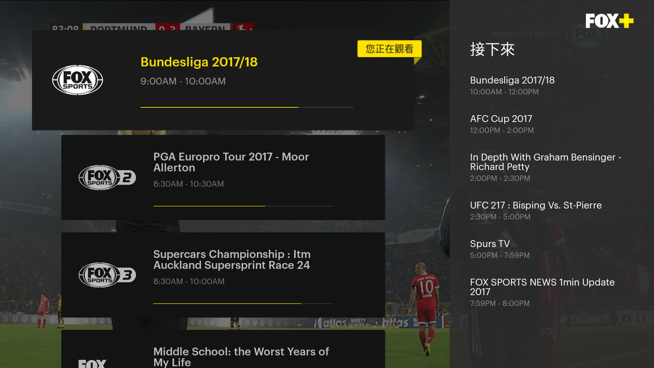 ▲ 以 Android TV 版《Fox+》觀看德甲賽事,感覺在電視上觀看畫面銳利度不俗,唯獨是幀率有點不足,用作觀賞體育節目會有不夠順暢之感。