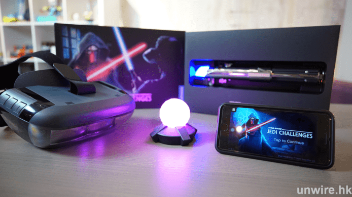 這套AR擴增實境的遊戲包括光劍、AR眼罩及追蹤信標球,大家最在意的當然是光劍吧!光劍沒有「光」的部分,只有劍柄和少許「光」。劍柄造型十分精緻,拿上手亦有質感,細節位十分仔細。成功連接後,劍的上方會發出藍光。不過雞蛋妹認為光劍還是原來的長度比較有氣勢,不過這個長度也較易收納。