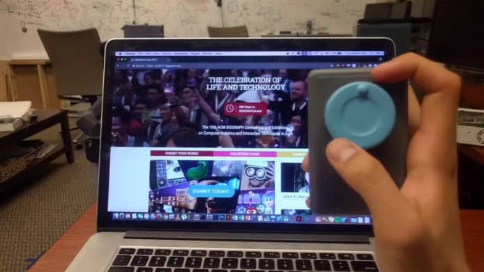 3D 打印製作的按鈕,亦可操作電腦,例如圖中的回轉器,輕輕旋轉一下,就令網頁捲動。