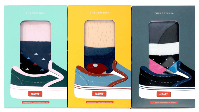 Thecoopidea 推出 HAIRY 便攜充電池這個念頭,這個 6000mAh 電量的 Power Bank,在外殼上不止有濃密的腳毛圖案,還特別加上製作難度極高的腳毛質感紋理,不但能看得見,更可以用手「Feel得到」。thecoopidea HAIRY 套裝不但有便攜充電池,套裝更附有一對「型格潮襪」,聖誕 Feel 滿分!