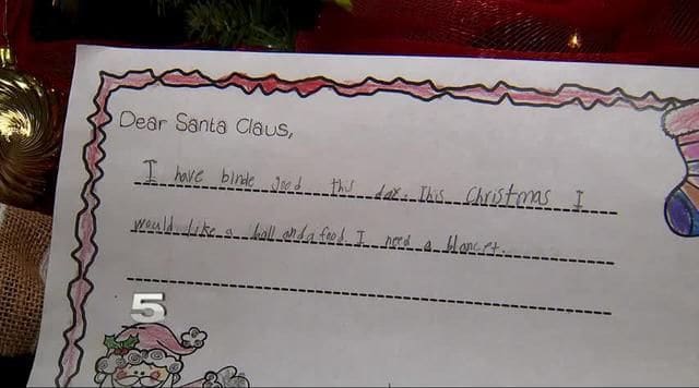 目前美國仍有不少家庭生活於貧窮線以下。這位名為 Crystal Pacheco 的女生,在寄給聖誕老人的信中寫道,這個聖誕節希望得到一個球,一點食物,還有一張毛毯。班主任老師 Ruth Espiricueta 看到這封信之後受到極大的衝擊,於是在 Facebook 發出帖文,希望大眾能夠捐助這位小女生實現她的願望。