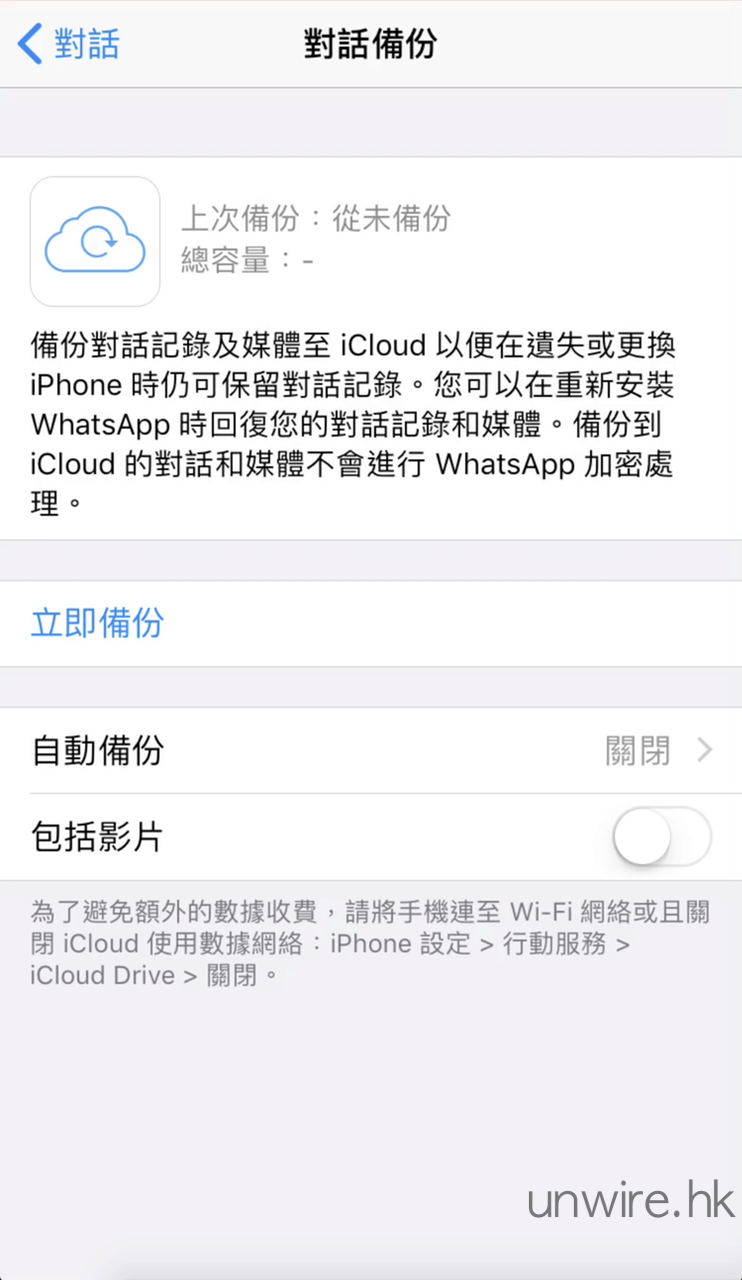 最後要做的,當然是進入設定 –> 對話 –> 對話備份,並將已轉移至 iPhone 的 WhatsApp 訊息好好備份一次,這樣就萬無一失了。