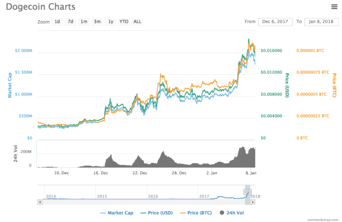 在去年 12 月中起,Dogecoin 的市值繼續大幅度上揚,直到今年 1 月 8 日更到達歷史新高,總市值超過 20 億美元。但這兩年期間, Dogecoin 並沒有發布過軟件更新,在技術上亦沒有明顯比比特幣更優勝的地方,使創辦人 Palmer 及分析師都大跌眼鏡。Palmer 同時表示,這個現象反映了虛擬貨幣市場已出現龐大泡沫,他預計區塊鏈技術會取得成功,但首次代幣發行 ICO 在泡沬化之下,很可能會面對失敗。