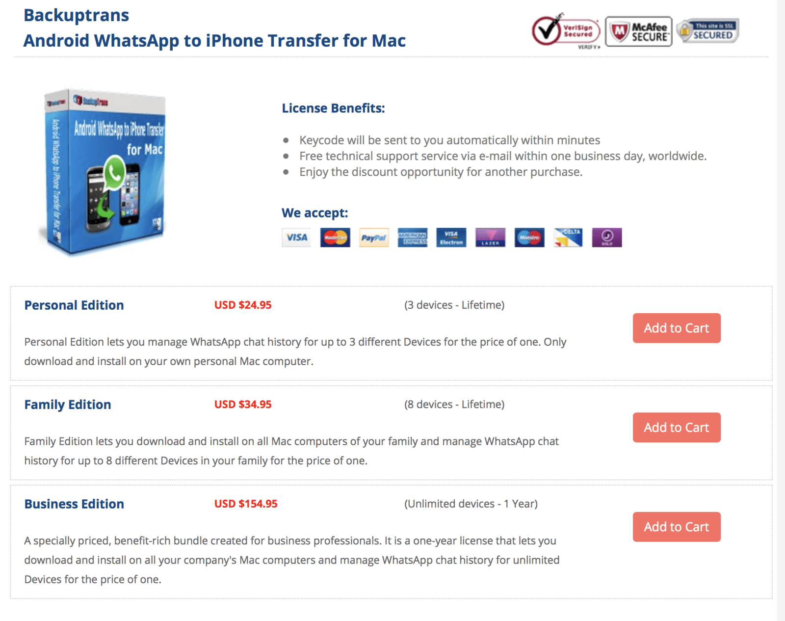 BackupTrans 有不少版本,如果大家單純只是想過 WhatsApp 去新機,本身是 iPhone 用家可以選購 Backuptrans iPhone WhatsApp to Android Transfer。收費方面,兩個軟件的 Windows 及 macOS 版本,均分別是 US$19.95(約 HK$156)及 US$24.95(約 HK$195)。