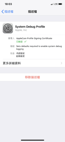 在安裝前你可確認將會安裝的內容,抽述檔名為「System Debug Profile」。請按畫面右上角「安裝」,再輸入主機 Passcode 即解鎖密碼確認。