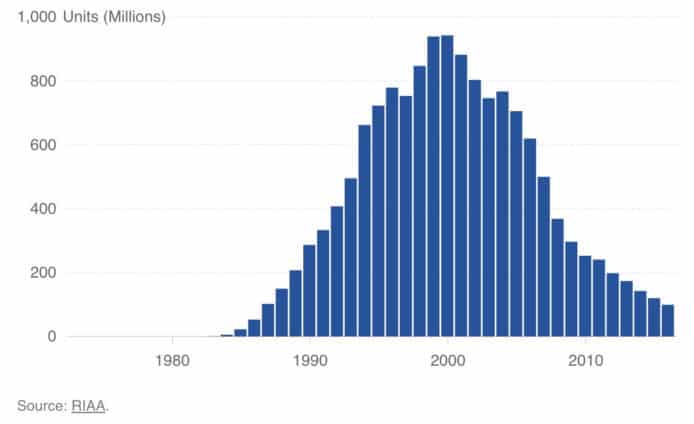 根據美國音樂貿易組織 RIAA 的數據,在2017年上半年,經由網路媒體所得的收入佔整體 62%,而實體唱片(包括CD與黑膠唱片)的零售只佔行業收入的 16%。而根據《Consequence of Sound》報道,在 2001 年美國 CD 唱片銷量達 8 億,但到了上年銷量已降至 8,900 萬。
