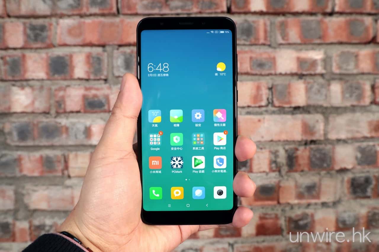 它配備了 5.99 吋 18:9 比例熒幕,迎合現時的手機熒幕潮流,不過由於取消了輕觸式按鍵,所以熒幕雖然長了,但機身沒有明顯變大,所以手感與以往的紅米手機是差不多的。