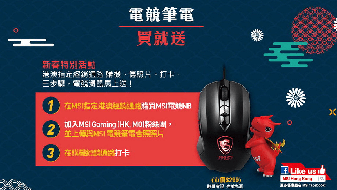 除附送贈品外,只要加入 MSI Gaming (HK, MO) Facebook,上傳與 MSI GAMING NOTEBOOK 合照並於購買地點打卡,即可獲贈 MSI 滑鼠乙隻(價值:$ 299)。更多詳細資料<按此>