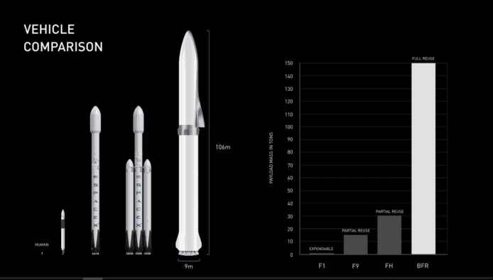 BFR 系統被定位成 Falcon Heavy 的精神後繼者。據目前的設計,將採用多達 37 個 Raptor 引擎,數據上能提供土星 V 型火箭兩倍的推進力。雖然它的最終目的是進行火星任務,但同時亦可透過太空中加油,進行地球至月面的來回飛行,以及為太空站進行補給。 BFR 系統被設計成可完全重覆使用,而且運載量多達 150 噸,相當於 Falcon Heavy 運載量的 5 倍。