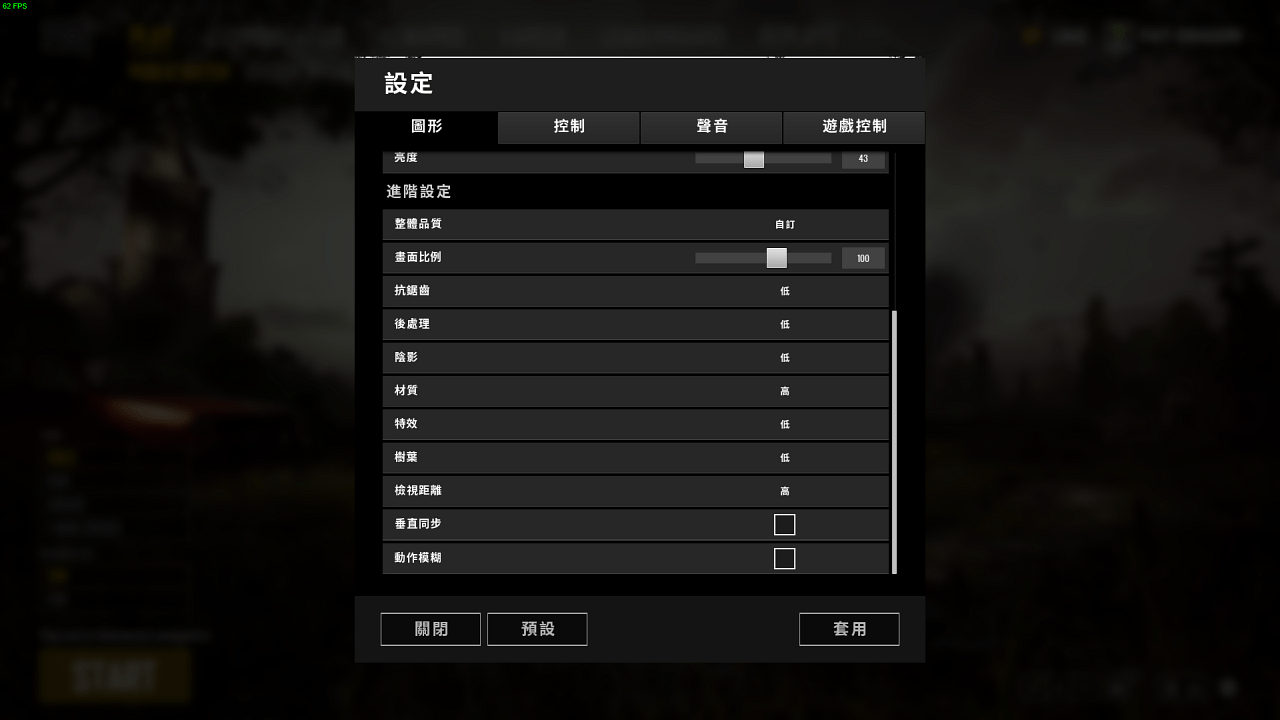 ▲另外,亦可把「整體品質」設定到「低」,在所有選項都變成了低時把「材質」及「檢視距離」設定成高,之後關閉「垂直同步」及「動作模糊」。在遊戲中,除了「材質」及「檢視距離」設定會對遊戲尋找敵人的影響性比較高之外其他選項在相較之下都沒有太過重要,這樣的設定合適大部分的中低階電腦。