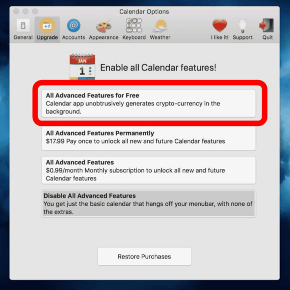 由 Qbix 公司製作的「Calender 2」macOS App 提供的收費版功能,是在基本行事曆功能外,提供的附加功能。在 App 裡面的介面中,顯示出想免費換取所有附加功能,可利用 17.99 美元一次性付費、每月 0.99 美元月費又或者允許程式在背後挖掘虛擬貨幣。一些不在乎用電量的用戶,或許希望選取最後這個選項,但由於以挖幣形式獲得利益,違反了「開發者需要令App更有效使用電力」的蘋果應用程式指引,因此「Calender 2」程式在 3 日後被下架。