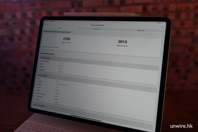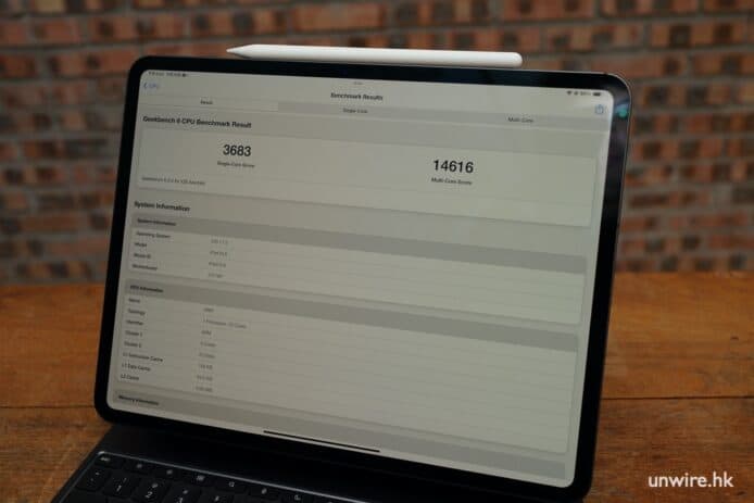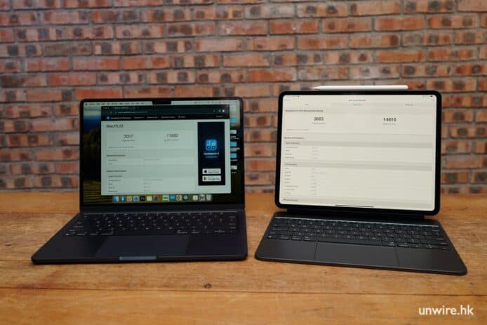 跑分數據可直接顯示處理器之速度。與上一代第 6 代 iPad Pro 比較,使用 M4 處理器的新 iPad Pro 在多核心跑分有逾 47.4% 增長,而單核跑分亦有 41.9% 效能增長。在跑分成績上,新 iPad Pro 更是第 4 代 iPad Pro 的接近 3 倍分數。