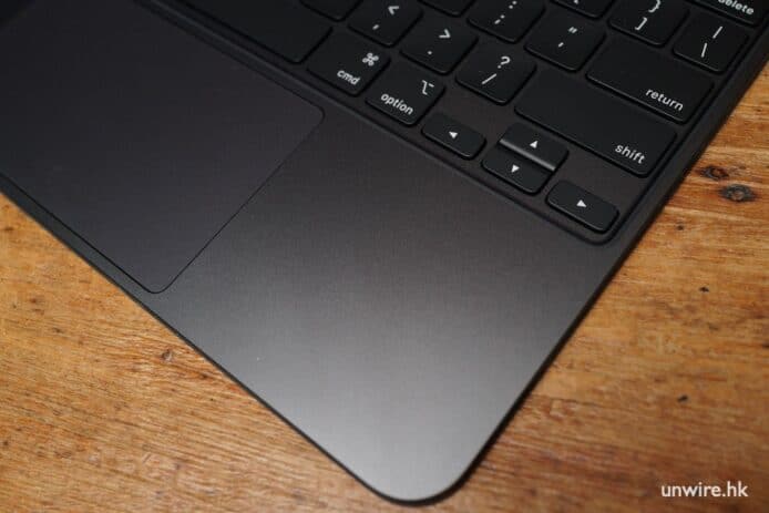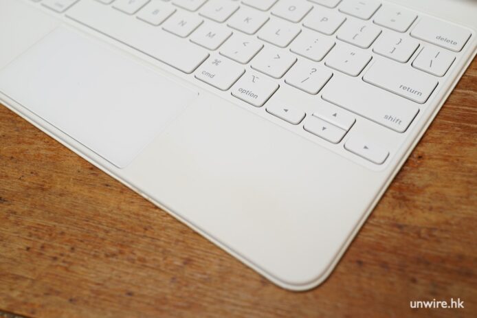 鍵盤的重量比上代精妙鍵盤還要輕大約 40g,而且更加薄,連同一樣變薄的 iPad Pro,帶出街的整體厚度更薄。繼承上代鍵盤,今代精妙鍵盤在旁邊設有 USB-C 插口,用以連接充電器或其他配件。