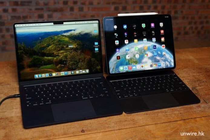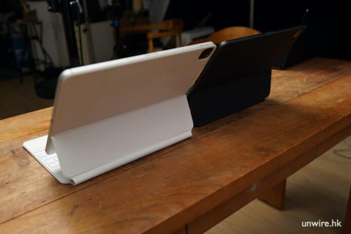 ▲如果與 MacBook Air 比較,iPad Pro(右方)鍵盤的懸浮設計令熒幕靠前一點