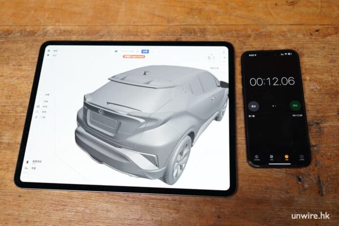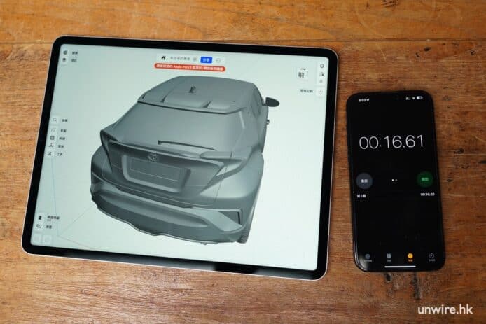 我們使用 Shapr3d 軟件開啟一個事先製作好的汽車模型。我們發現同一個專案檔案,在 M4 版 iPad Pro 的讀入時間(包含處理時間)只需約 12 秒,但相同的檔案在 M2 版 iPad Pro 上讀入時間就要用上約 16 秒。