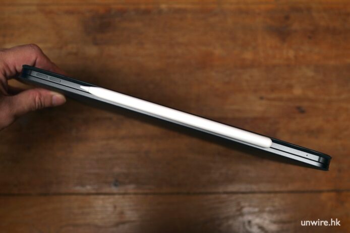 ▲雖然新 iPad Pro 機身變薄,但連同鍵盤一齊用,厚度都足夠放置 Apple Pencil Pro