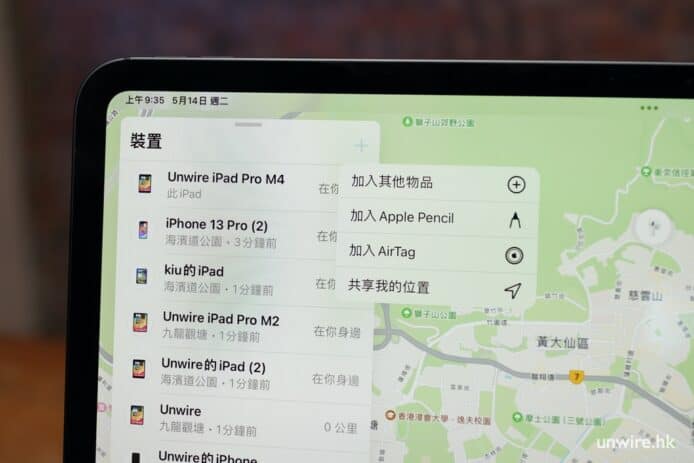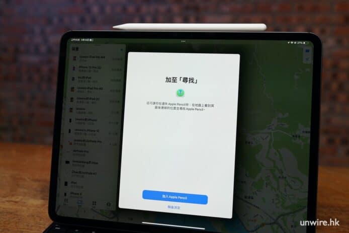 另外,Apple Pencil Pro 支援「尋找」(Find My)功能,讓用戶在房間內找不到觸控筆時,可以使用 iPhone 幫助定位,快速找回。操作也很易明白,首先你要打開「尋找」App 登記你的 Apple Pencil Pro(在裝置清單按「+」選「加入 Apple Pencil」),再把觸控筆放在磁石貼的位置,便可登記完成。