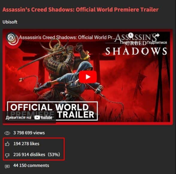 ▲《刺客教條:暗影者》預告片高達 216914 個 Dislike