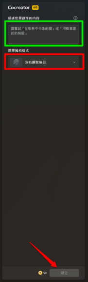 用家可以在下圖綠色框輸入 Prompt,紅色框部分可選擇生成各種不同風格的圖片,填妥資料後按紅色箭嘴指住的「建立」即可生成 3 張圖片。