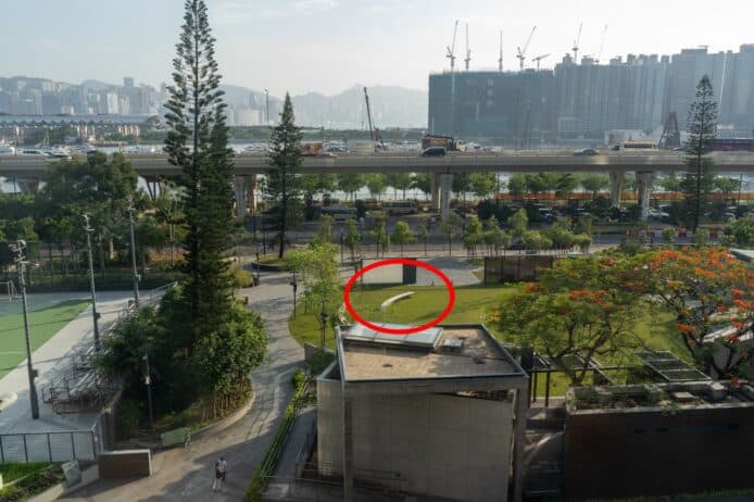 NETGEAR Orbi 970 以覆蓋範圍廣見稱,為測試這個路由器的覆蓋範圍,小編在公司窗邊安裝了 NETGEAR Orbi 970 的衛星子機,然後到樓下公園(紅圈示)嘗試能否連接 Wi-Fi。