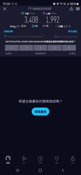 小編在沒有牆壁阻隔的情況下,Samsung S24 Ultra 手機距離路由器約 5 米再使用測速軟件,測得下載 3,408 Mbps,上載 1,992 Mbps,延遲仍能夠保持在 6 ms。