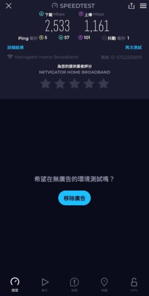 小編這次在隔住一面牆,Samsung S24 Ultra 手機遠離路由器 10 米的情況下使用測速軟件,下載錄得 2,533 Mbps,上載 1,161 Mbps,延遲 5 ms,即使隔住一面牆,表現仍然令人滿意。