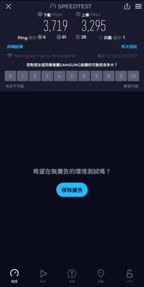 首先我們在Samsung S24 Ultra 手機裝上「Speedtest」網絡測速軟件,距離路由器 2 米範圍內測得下載 3,719 Mbps,上載 3,295 Mbps,延遲 6 ms。