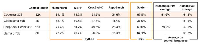 Mistral 表示,Codestral 可以完成編程、測試、填充部分程式碼等任務,並以自然語言回答有關程式碼庫的問題。在幾個基準測試中,Codestral 的表現與目前其他類似模型例如 Llama 3、CodeLlama 以及 DeepSeek Coder 相約。