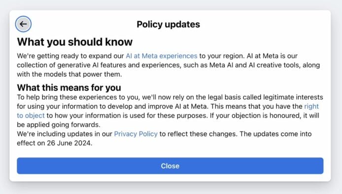 Meta 在通知上表示,為了符合歐盟 GDPR 和英國的類似規定,他們正在向當地用戶發出私隱政策修改通知,根據該政策,Meta 使用「在 Meta 產品和服務上分享的公開資訊」,包括貼文或照片來訓練其 AI 模型,但不包括私人內容,例如 Messenger 上的對話以及標籤為「私人」的內容等。
