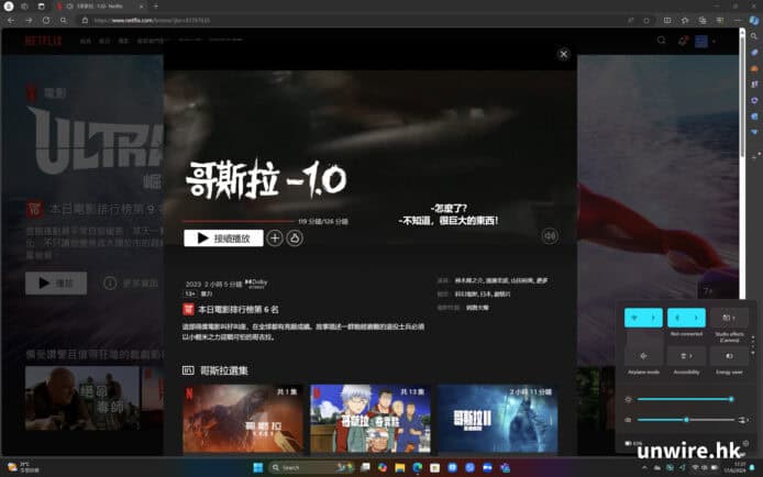 最後使用時間方面,Samsung Book4 Edge 內建了 61.8Wh 容量鋰離子充電池,官方表示可提供最長 22 小時的使用時間,筆者就試過在 Book4 Edge 上將電池充滿至 100%,並在熒幕亮度調至最高,音量設定為 50% 左右情況下,以 Edge 瀏覽器及全熒幕模式,以 Wi-Fi 接駁上網並串流播放 Netflix 平台上的《哥吉拉 -1.0》電影,在播放完約 2 小時的電影後,電量由 100% 跌至 83%,在這個比較嚴苛的測試環境下也只是跌了 17% 電量,以此推斷即使連續使用,完全可以使用 12 小時以上;而一般生活應用情況下,使用一日以上應該問題不大,由此可見它的使用時間確實十分「長氣」,值得一讚。