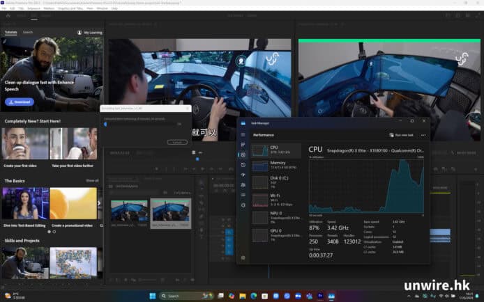 ▲那麼最嚴苛的工作:在 Book4 Edge 上以 Premiere Pro 進行影片渲染,資源耗用的情況又如何呢?大家可以見到未進行影片渲染前,CPU、GPU 及 RAM 資源分別使用了 2%、1% 及 69%,而正在進行影片渲染時,三者資源耗用就分別升至 87%、1% 及 81%,由此可見即使以 Book4 Edge 進行 4K 影片渲染,它依然可以做到,而且只是處理器及 RAM 會耗用較多資源,基本上是用不到 GPU 資源的。
