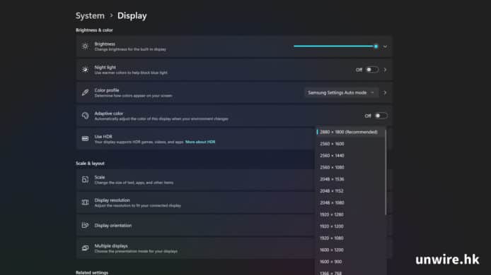 至於顯示方面,Samsung Book4 Edge 內建了 16 吋 Dynamic AMOLED 2X 熒幕,支援 2880 x 1800 解像度及最高 120Hz 更新率,而且支援高達 120% DCI-P3 色域,無論是用來瀏覽文件、睇網頁等文字及相片為主的內容,或者用來睇戲、煲劇等以影像為主的內容亦十分不錯,文字清晰銳利,影像鮮艷得來顏色偏自然向,而且可視角度亦十分高,整體表現十分出色。唯一是雖然官方表示它內建康寧的 Gorilla DX 強化玻璃,可減少熒幕反光,但筆者肉眼所見反光情況依然比較明顯,如果長期以最高亮度瀏覽內容,雙眼仍容易感到疲倦,有點可惜。