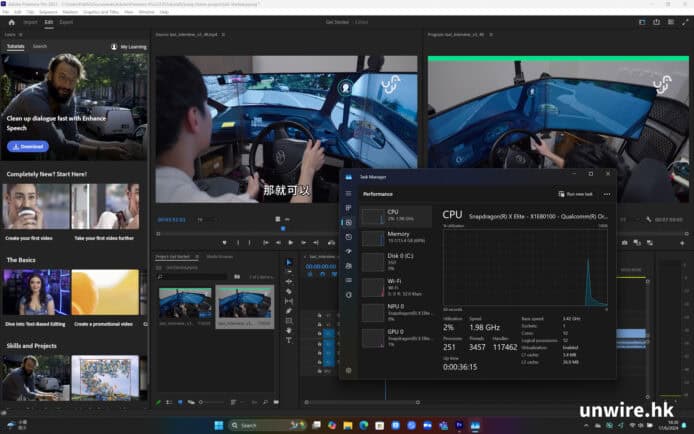 ▲那麼最嚴苛的工作:在 Book4 Edge 上以 Premiere Pro 進行影片渲染,資源耗用的情況又如何呢?大家可以見到未進行影片渲染前,CPU、GPU 及 RAM 資源分別使用了 2%、1% 及 69%,而正在進行影片渲染時,三者資源耗用就分別升至 87%、1% 及 81%,由此可見即使以 Book4 Edge 進行 4K 影片渲染,它依然可以做到,而且只是處理器及 RAM 會耗用較多資源,基本上是用不到 GPU 資源的。