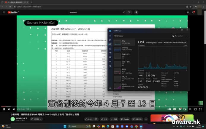 ▲至於睇片方面,筆者分別以 Chrome 瀏覽器播放 YouTube,及以 Edge 瀏覽器播放 Netflix 影片,兩者均以近乎或全熒幕模式播放。結果兩個情境下,CPU 使用資源也只是約 10% 至 17% 左右,GPU 資源會用多一點,但也是維持在 50% 以下。而 RAM 方面,也是使用了 50% 至 60% 左右,應付上依然輕鬆。